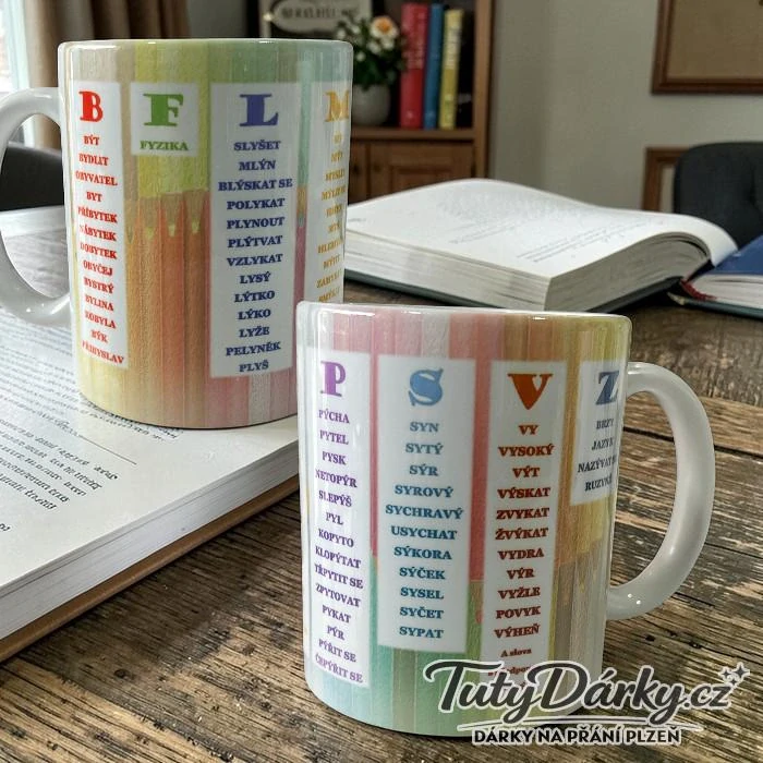 Hrnek s vyjmenovanými slovy je chytrá a praktická pomůcka pro děti na základní škole. Obsahuje přehled vyjmenovaných slov po B, L, M, P, S, V a Z, díky čemuž mají školáci učivo českého jazyka neustále na očích.