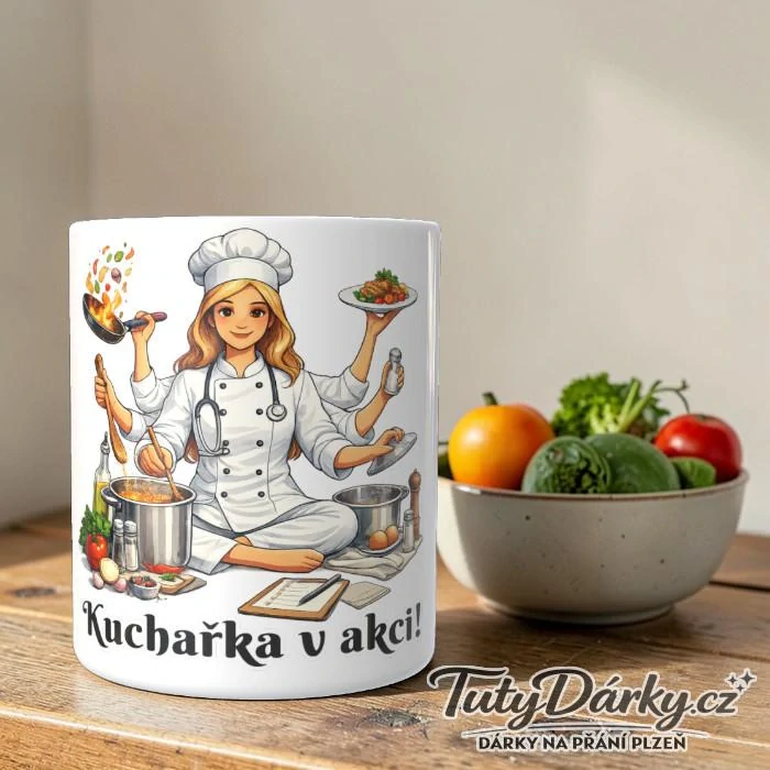 „Kuchařka v akci!“ je motiv pro všechny ženy, které mají v kuchyni superschopnosti. Jednou rukou míchá omáčku, druhou obrací maso, třetí dochucuje a čtvrtou servíruje. Multitasking? Samozřejmost!