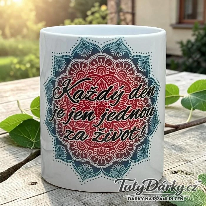 Hrnek s mandalou a inspirativním citátem „Každý den je jednou za život“ přináší klid, harmonii a připomínku toho, co je opravdu důležité. Jemný motiv mandaly působí uklidňujícím dojmem a vytváří příjemnou atmosféru při každém doušku.