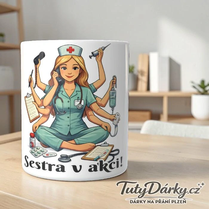 Představujeme hrnek „Sestra v akci!“, který dokonale vystihuje realitu každé zdravotní sestry – milion rukou, nekonečná energie a úsměv i po noční!