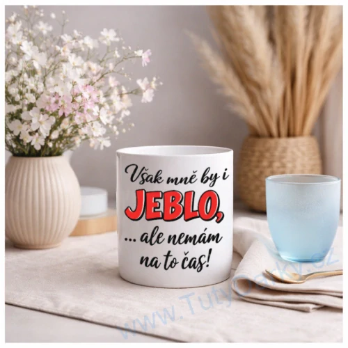 Stylový bílý hrnek s trefným nápisem „Však mně by i JEBLO, …ale nemám na to čas!“ je ideální parťák pro ranní kávu, odpolední čaj i tiché vnitřní paniky, které řešíme s úsměvem.